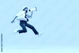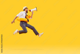 Full body photo of a funny man in office clothes and in sunglasses with duck rubber ring jumping and speak in mouthpiece on studio yellow background. Summer holiday trip and vacation concept.