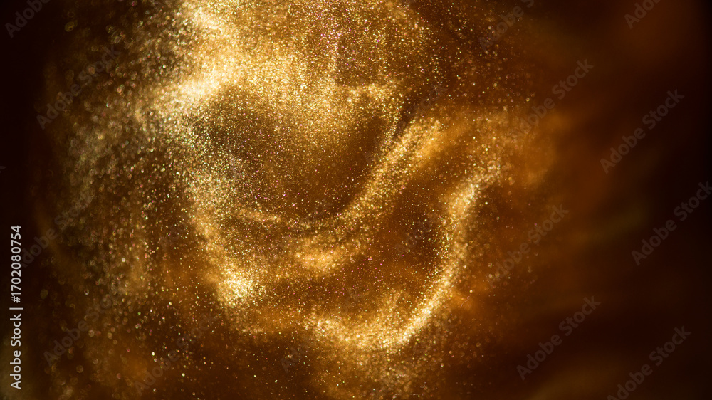 Gold particles floating abstract background, Liquid gold, golden art, abstract backdrop. Beautiful metallic dust yellow texture, Metallic paint close-up. Art Wallpaper waves surface