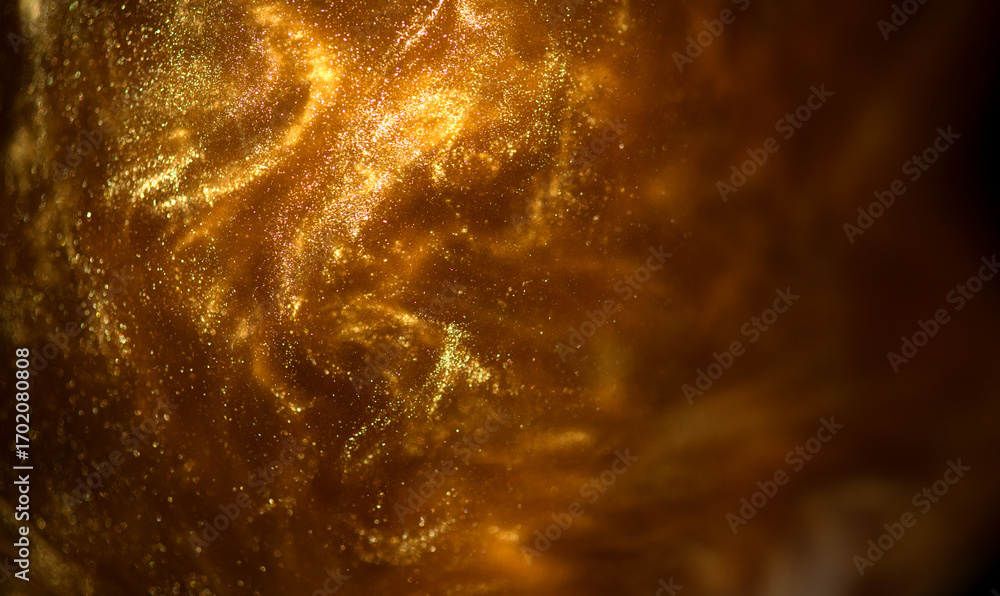 Gold particles floating abstract background, Liquid gold, golden art, abstract backdrop. Beautiful metallic dust yellow texture, Metallic paint close-up. Art Wallpaper waves surface