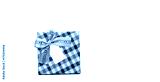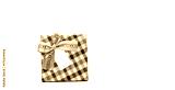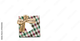 Plaid pattern gift box with beige ribbon bow and blank greeting card isolated on white background with copy space, just add your own text. Use for Christmas and new year festival