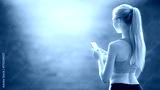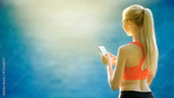 young blonde woman stands on a blue sea background with a mobile phone. A sporty woman uses a phone near the sea