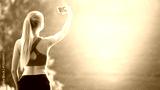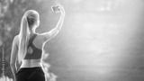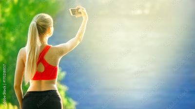 young blonde woman stands on a blue sea background. Sports woman in red t-shirt makes selfie on nature near the sea