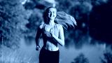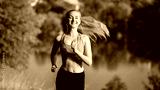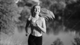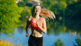 young blond woman running on nature. A sports girl in a red T-shirt runs along the park near the river.