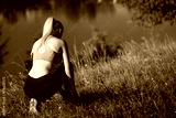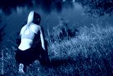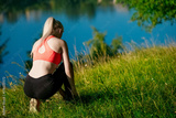 Sports girl blonde in a red T-shirt sat down to tie laces on sneakers in a park near the river.