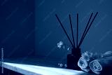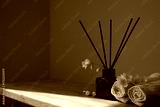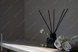 Modern composition of perfume in black glass diffuser with sticks decorated flowers and towels for home aromatherapy.
