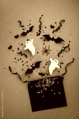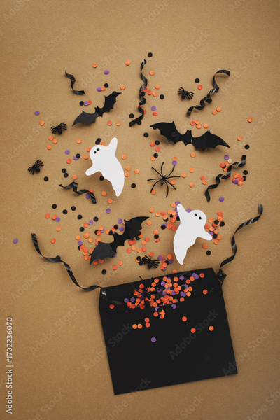 Halloween party composition from envelope with festive decoration from bats, ghosts and confetti on golden background top view.