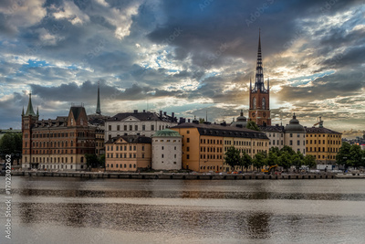 Stockholm's Historic Core: A shot of Gamla Stan, its iconic buildings, and cobblestone charm with dramatic sunset sky