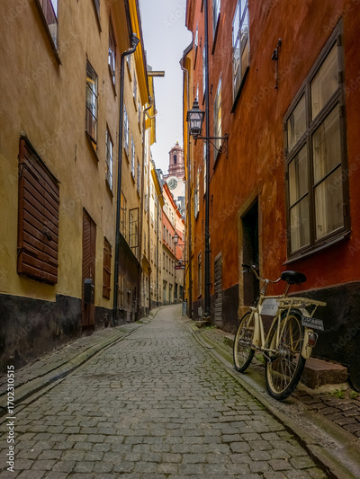 Historic narrow alley with colorful walls, bicycle in Gamla Stan, Stockholm Old Town with cobble stone street