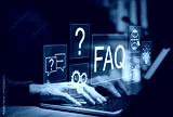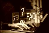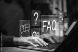 FAQ and AI chatbot support concept. Person typing on laptop, surrounded by question icons, automated answers, global access, intelligent solutions for customer service and digital assistance. Q and A