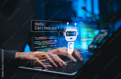 AI coding assistant for software development concept. Machine Learning Code, Programmer use laptop with code and AI robot represent artificial intelligence, AI programming, software development tools,