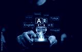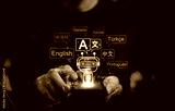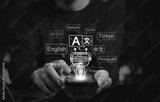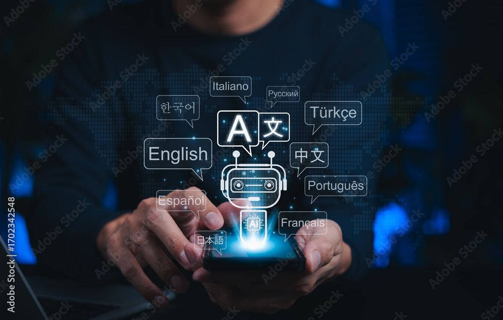 AI-Powered Language Translate App Concept. A person holds smartphone displaying an AI powered language translation app. Screen features robot and multiple languages, symbolizing global communication.