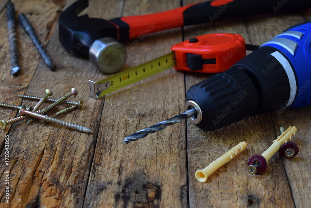 Set of tools for building and treatment on wooden background: hammer, measuring tape, drill