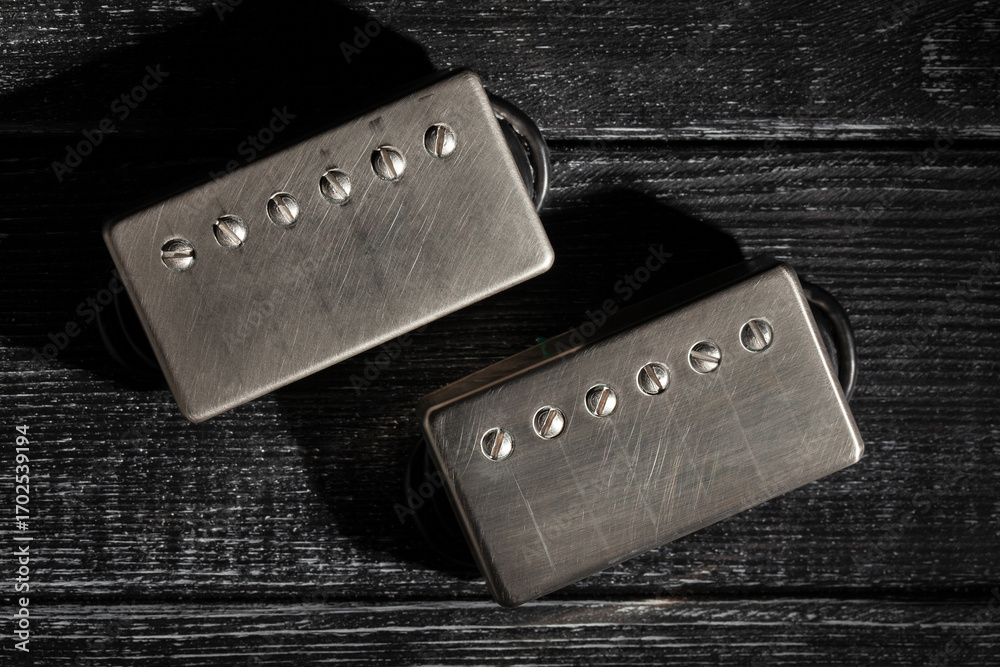 humbucker pickups on black wood background top view