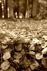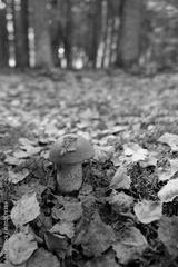 edible mushroom in fallen leaves close up, natural forest background. Beautiful image of wild nature. Autumn harvest season, picking fungi. wild Forest aesthetic.