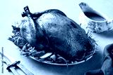 Turkey served with figs and apples. A traditional festive dish. Yellow background. Close up.
