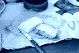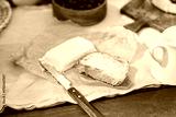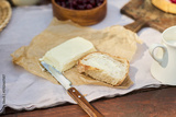 Slice of rustic bread and block of butter resting on parchment paper with butter knife placed beside, wooden table surface visible, ceramic cup with milk standing nearby