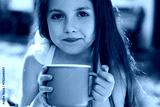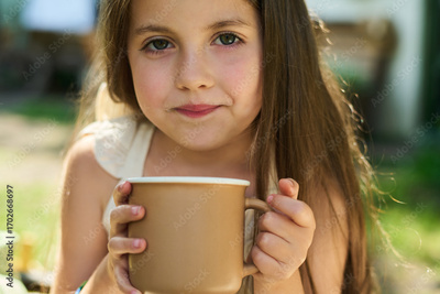 Portrait of Caucasian girl child holding large mug with both hands, looking into camera with slight smile, long brown hair framing face, sitting outdoors in natural light