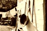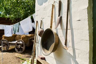 Old metal pan and vintage gardening tools hanging on brick wall outdoors, wooden wagon wheels and hay bales in background, laundry drying on clothesline nearby