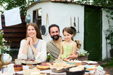 Caucasian woman, middle aged Caucasian man, and young Caucasian girl sitting together at outdoor table enjoying meal, smiling and looking toward camera in backyard setting