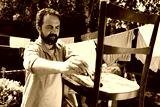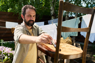 Middle aged Caucasian man sanding wooden chair outdoors, focusing on restoring furniture with laundry hanging in background, sunlight filtering through trees, hands working carefully