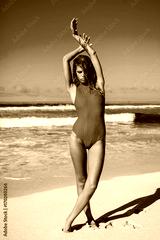 Young attractive woman in swimwear posing on sandy beach during daytime