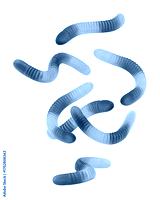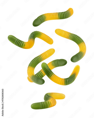 Falling Gummy candy worm, isolated on white background, full depth of field