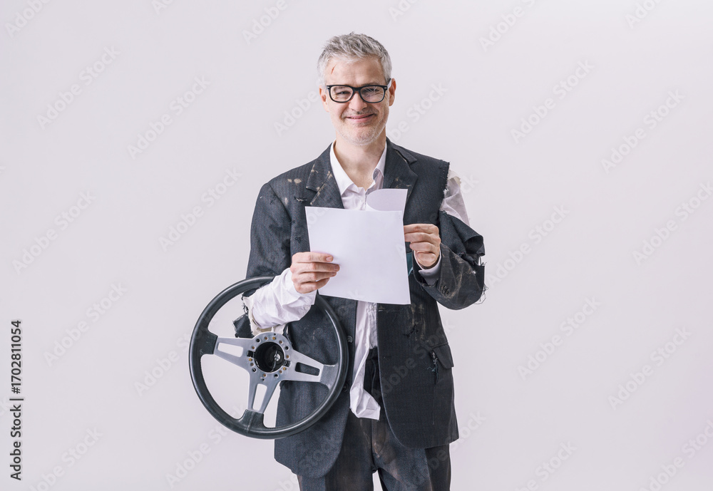 Funny Accident Concept With Man In Torn Suit Holding Steering Wheel And Insurance Contract