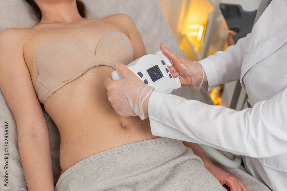 Young woman girl undergoes abdomen vacuum massage by cosmetologist using LPG device for slimming and body shaping. Clinic procedure promotes firm skin, fat breakdown, visible figure correction