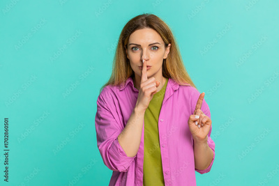Middle-aged woman gently places finger on lips, signaling to be quiet, keep secret or avoid noise with soft serious expression. Girl isolated on blue background shows silent gesture, confidentiality.