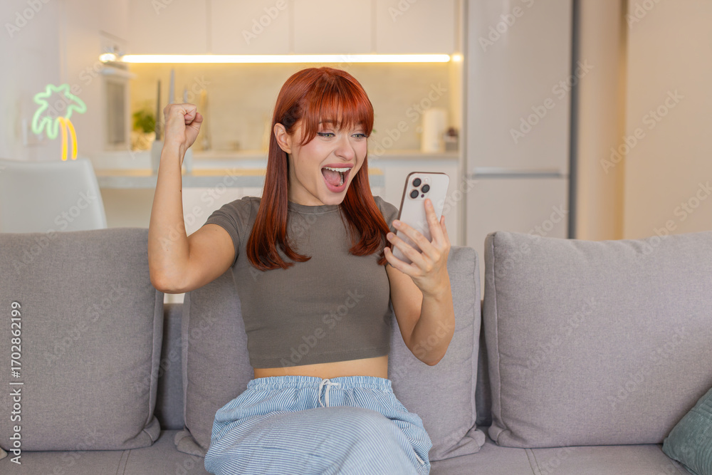 Young woman at home checks smartphone reads good news jumps for joy celebrates success. Redhead girl on sofa raises fist happy reaction winner emotion mobile phone celebration mood big smile and cheer