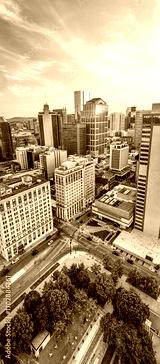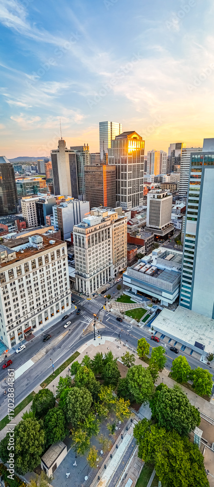 Panoramic view of Nashville skyline at sunset with river, skyscrapers, and city landmarks