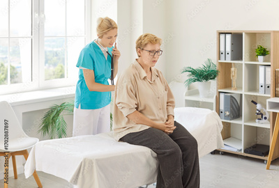 Nurse listening senior woman breathing on medical examination with stethoscope in clinic. Old patient sitting on bed to breath, healthcare worker checking lung and heart health on appointment