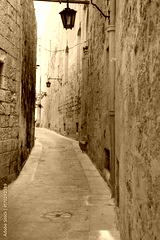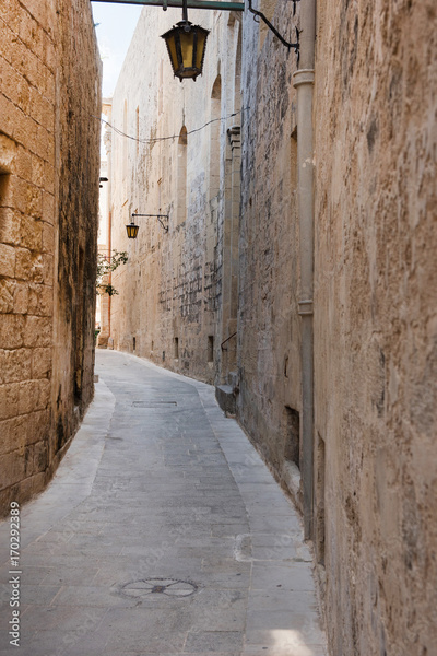 Narrow medieval street with stone houses in Mdina, Malta