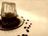 Freshly brewed black coffee served in an inverted cup with coffee beans spread around, representing lifestyle and cafe culture.