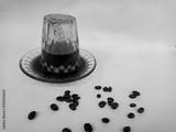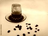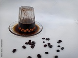 Freshly brewed black coffee served in an inverted cup with coffee beans spread around, representing lifestyle and cafe culture.