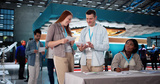 Engaging Audience At Trade Show: Saleswoman Presents Diverse