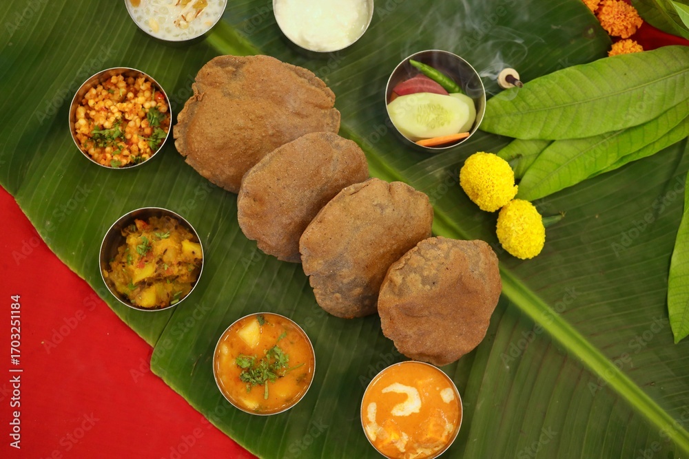 Navratri Upwas Thali Fasting food platter on banana leaf background