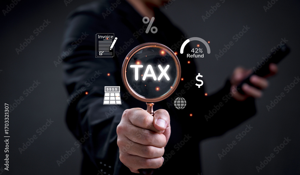 Businessman holding magnifying glass with tax word and finance icons for concept of tax planning, refund, accounting and financial management of business and investment strategy.