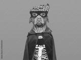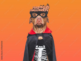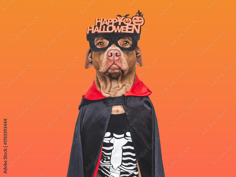 Happy Halloween. Charming dog and Halloween costume. Closeup, indoors. Studio shot. Congratulations for family, relatives, loved ones, friends and colleagues. Pet care concept