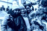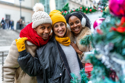 Happy multi ethnic friends enjoying christmas city during winter holidays