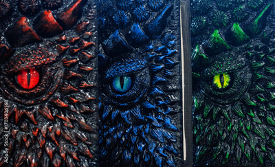 Captivating close-up of three fantasy dragon eye journal covers in vibrant red, blue, and green. Featuring intricate scales and horns, perfect for magic, myth, and gothic themes.