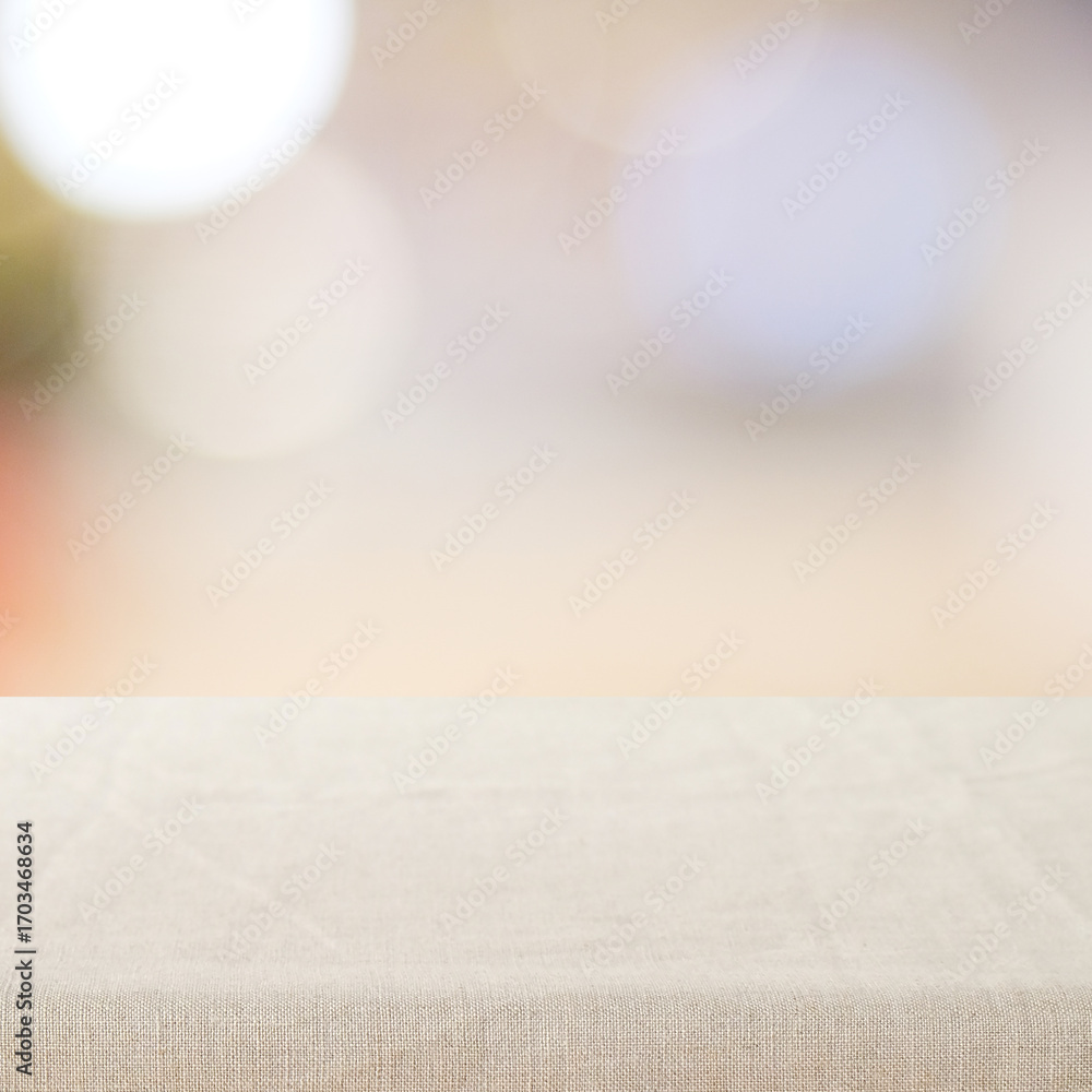 Empty table with linen tablecloth over blurred abstract with bokeh background banner, food and product display montage template, backdrop, wallpaper
