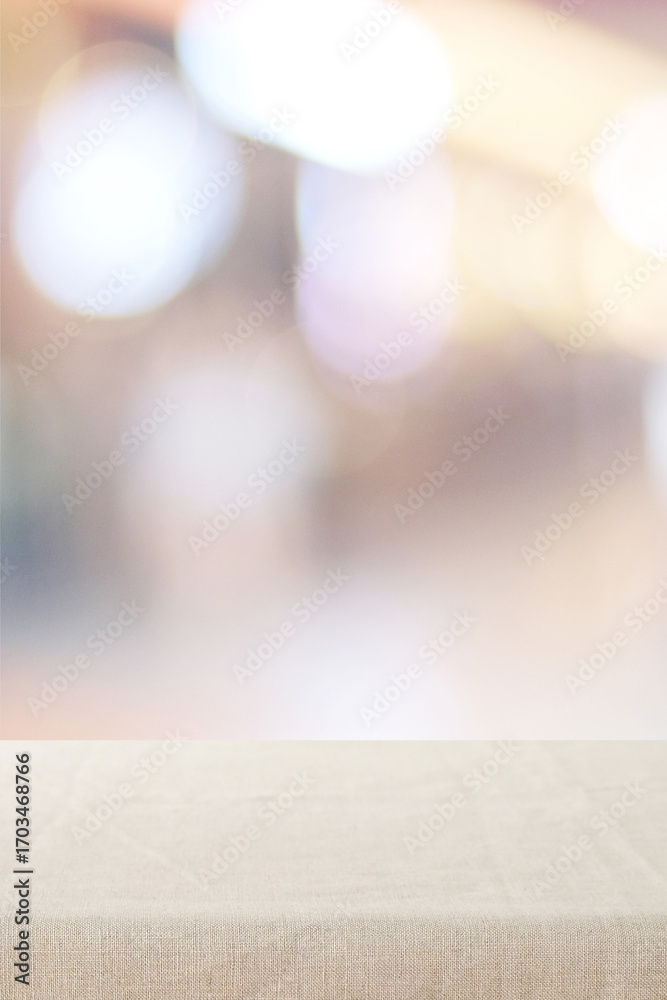 Empty table with linen tablecloth over blurred abstract with bokeh background banner, food and product display montage, vertical