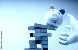 Piggy bank suddenly falls off unstable Jenga block, hands protecting it, symbolizing fragile financial stability and economic uncertainty, need for caution