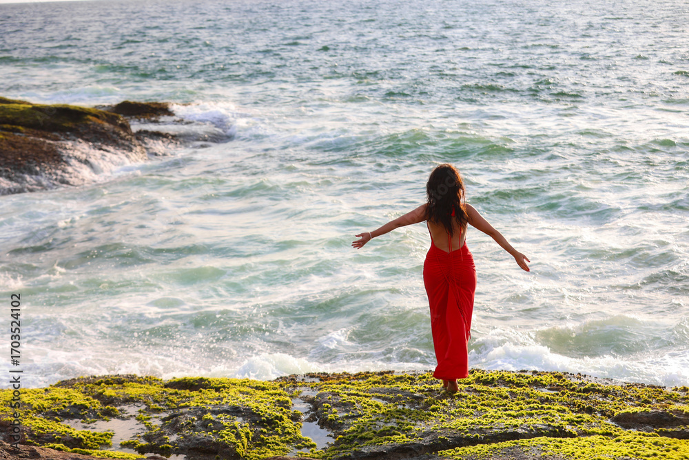 Woman in red dress with arms outstretched, overlooking the ocean