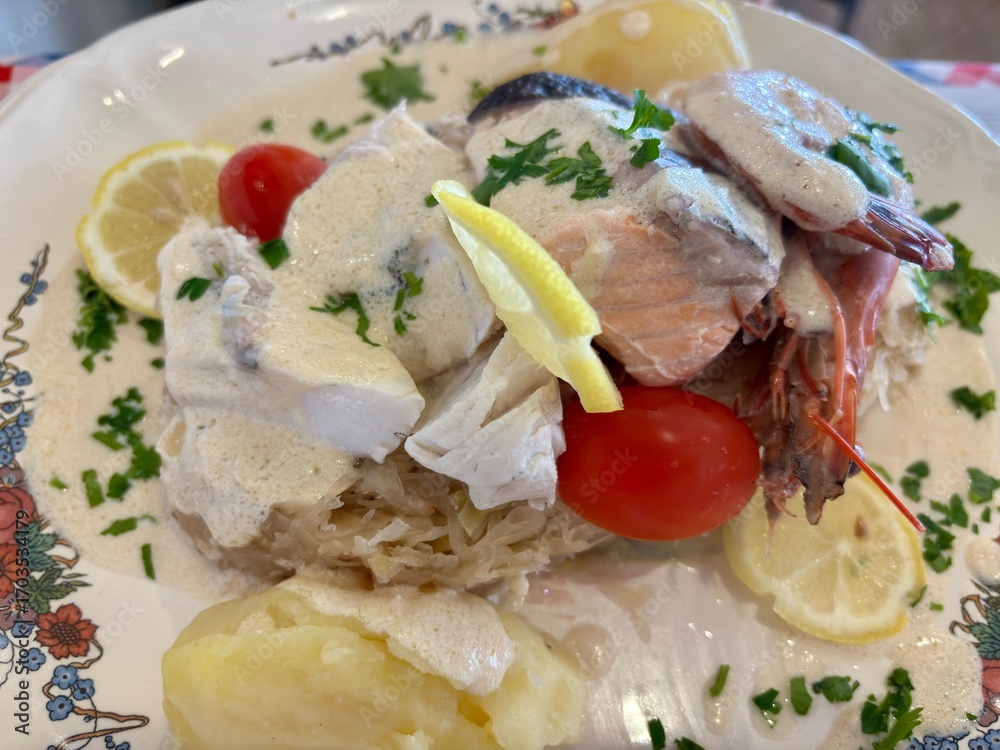 Choucroute alsacienne aux 3 poissons, sandre, saumon, gambas, chou,