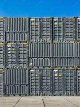 Container transportation. Stacks of gray shipping containers. A large number of metal containers for storing goods, mounted in rows on top of each other. Cargo containers at the port.