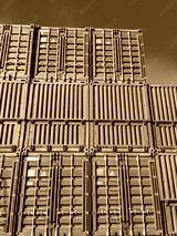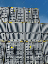 Stacks of gray shipping containers. Cargo containers at the port. Container transportation. A large number of metal containers for storing goods, mounted in rows on top of each other.