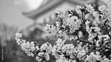 View of Himeji castle from behind cherry blossom blooms
