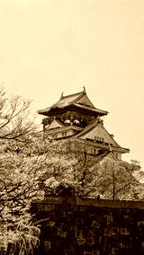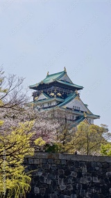 Osaka Castle in Japan in the background, foreground focus on blooming cherry blossoms trees